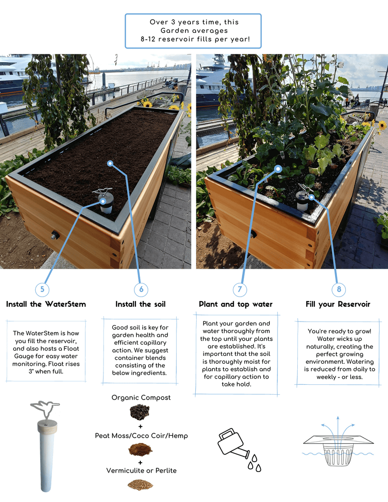 Choose a quality soil mix to fill your garden planter box. Ensure proper drainage with pebbles or gravel at the bottom. Add organic matter for nutrients, and fill up to two inches below the rim.